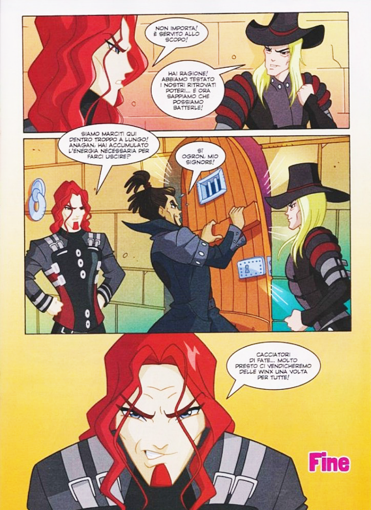 Les Fans de la BD le savent peut être, les Sorciers du Cercle Noir ne sont pas morts à Oméga. En effet, il y a maintenant quelques années, les Sorciers faisaient leur premier grand retour dans la BD, libérés dans le N°85 par un Spectre Démoniaque. Pendant quelques BD, ils ont semé la pagaille, combattu les Winx. Et finalement, ils ont été arrêtés et emprisonnés à Solaria. Mais il semblerait bien qu’à la fin de la dernière BD, les Sorciers aient l’intention de s’échapper. Ce qui agite beaucoup la toile en ce moment, beaucoup se demandent si les Sorciers ne seraient pas les Méchants de World Of Winx. Pour moi, c’est peu probable, mais la Théorie reste intéressante. En tout cas, on risque bien de les voir dans les prochaines BD pour notre plus grand plaisir (Ou pas.). Voici les 2 dernières pages du N°145 rien que pour vous :